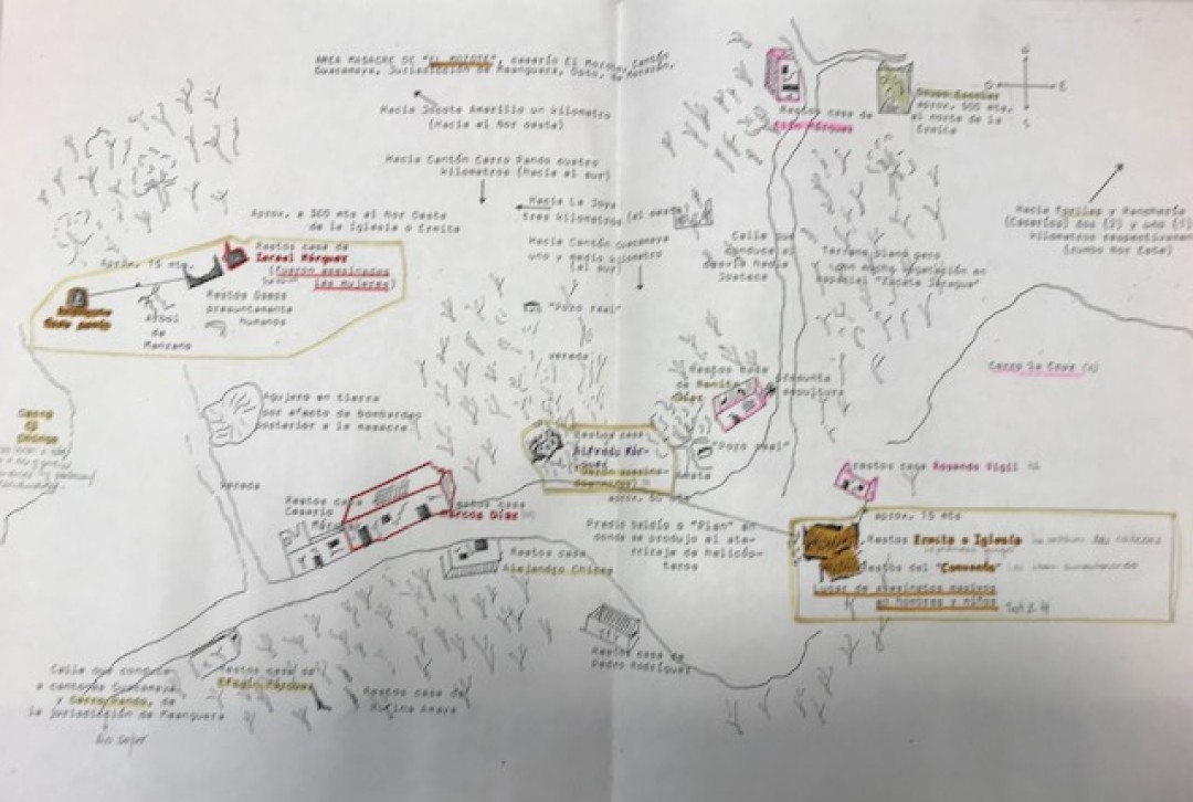 Photographic documentation of the El Mozote massacre, December 1981. Photo by Susan Meiselas.Freehand Graphic of the Hamlet of El Mozote