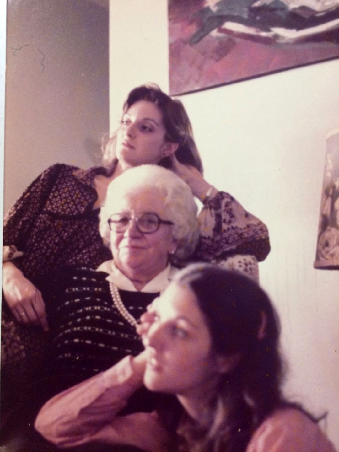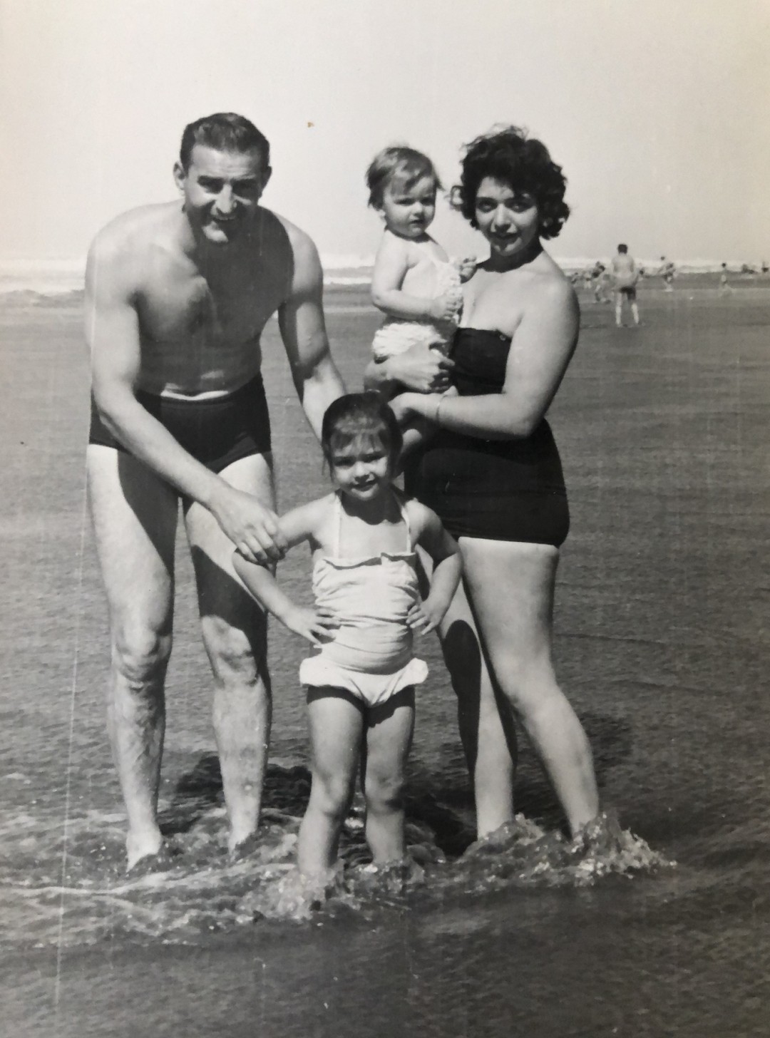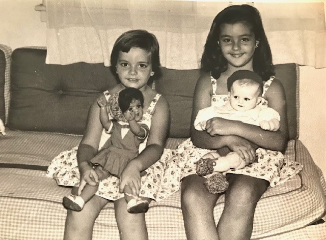 At the beach in Necochea. Claudia is the girl in the middle and Patricia is being held by her mother, 1959.The Girls with Their Grandmother