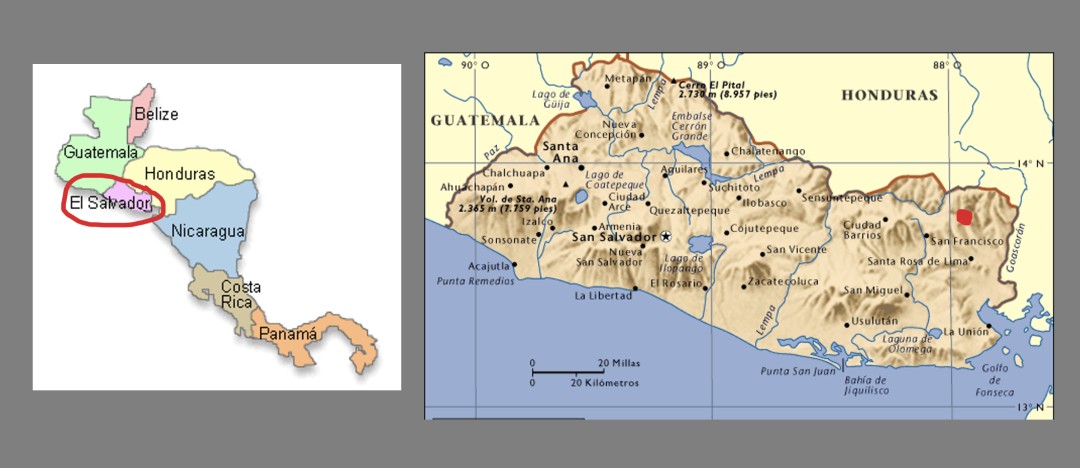 These two maps show El Salvador in Central America. In the graphic to the right, the hamlet of El Mozote in the Morazán Department is highlighted with a red dot in the top right-hand corner.The El Mozote Massacre, 1981