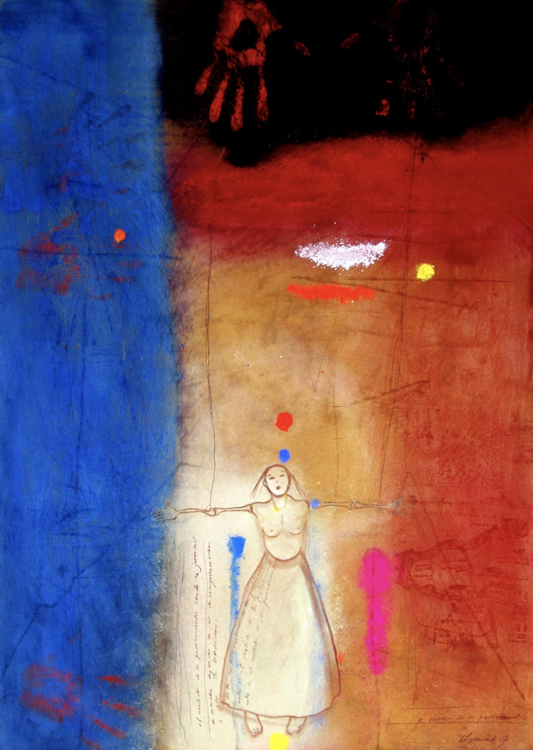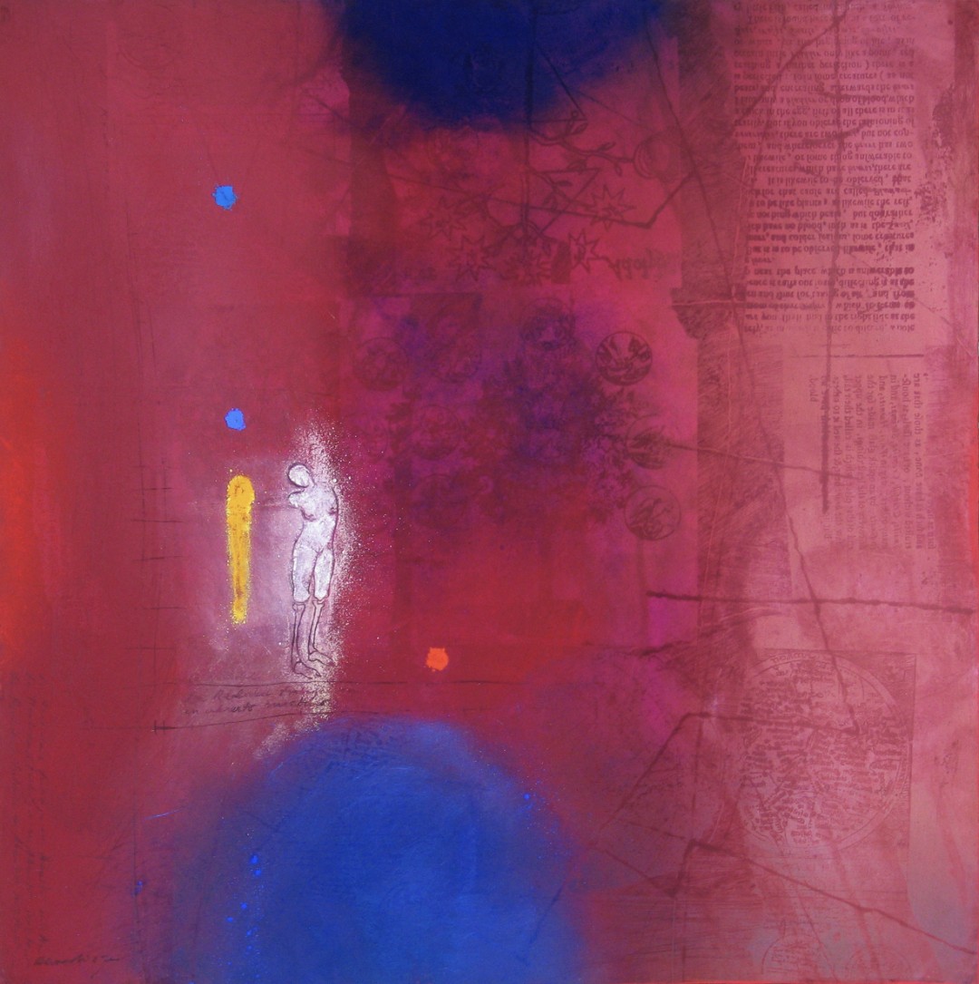 Maps, poems, names, texts, photos, are interspersed among the pigments. They are revealed or they remain hidden. (2004, 30” x 42”)Amputated Hands