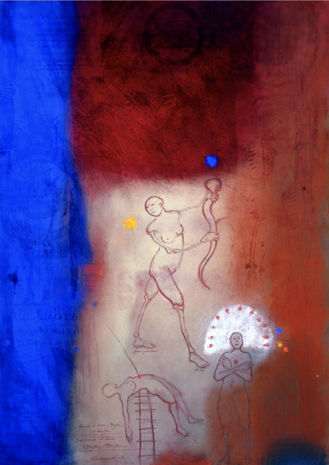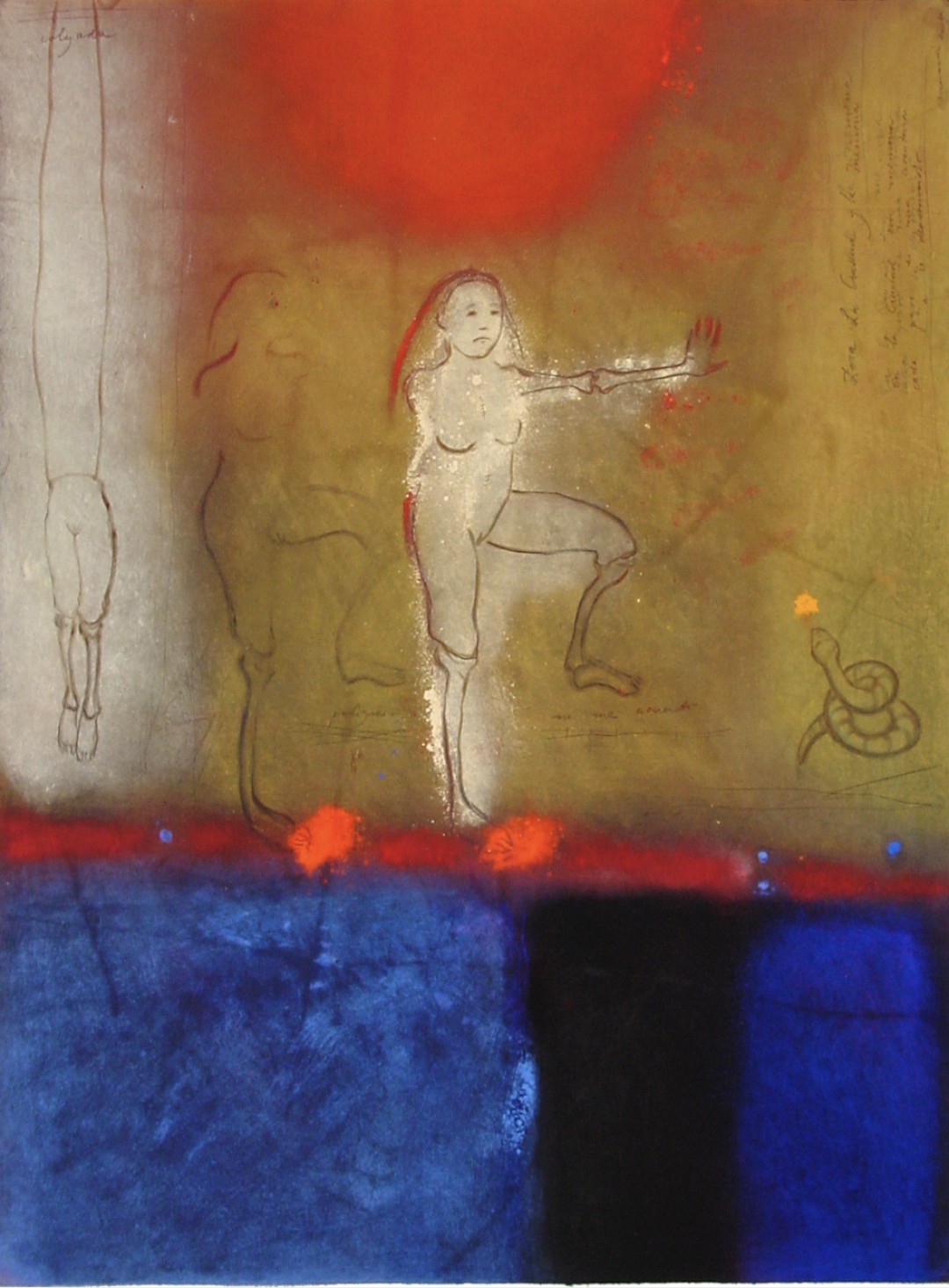 Pigments are colored powders of enormous intensity that refuse to remain on the paper. They are adhered in multiple layers that interact with one another. (1996, 30”x60”)What Terrible Luck, Girl