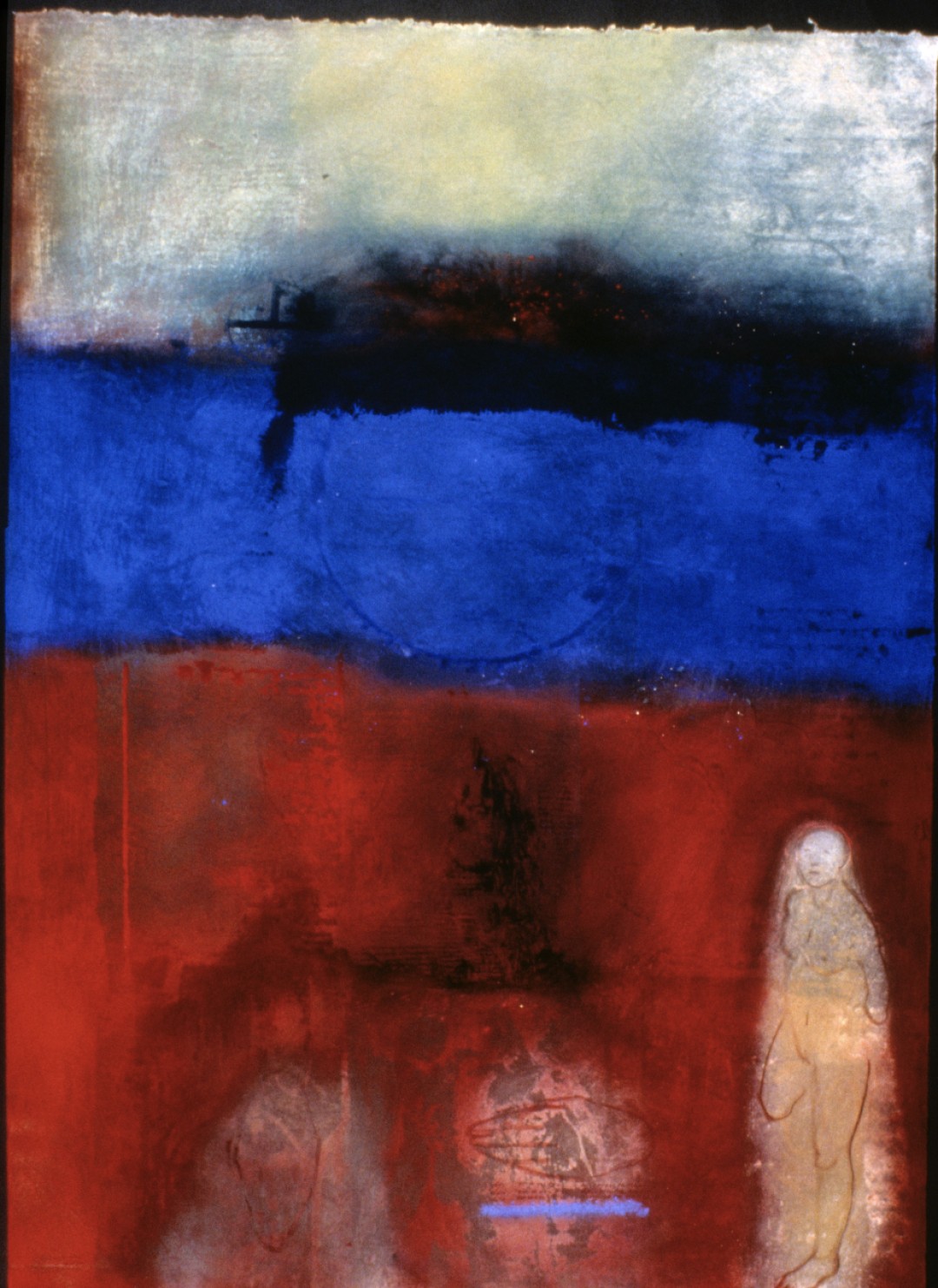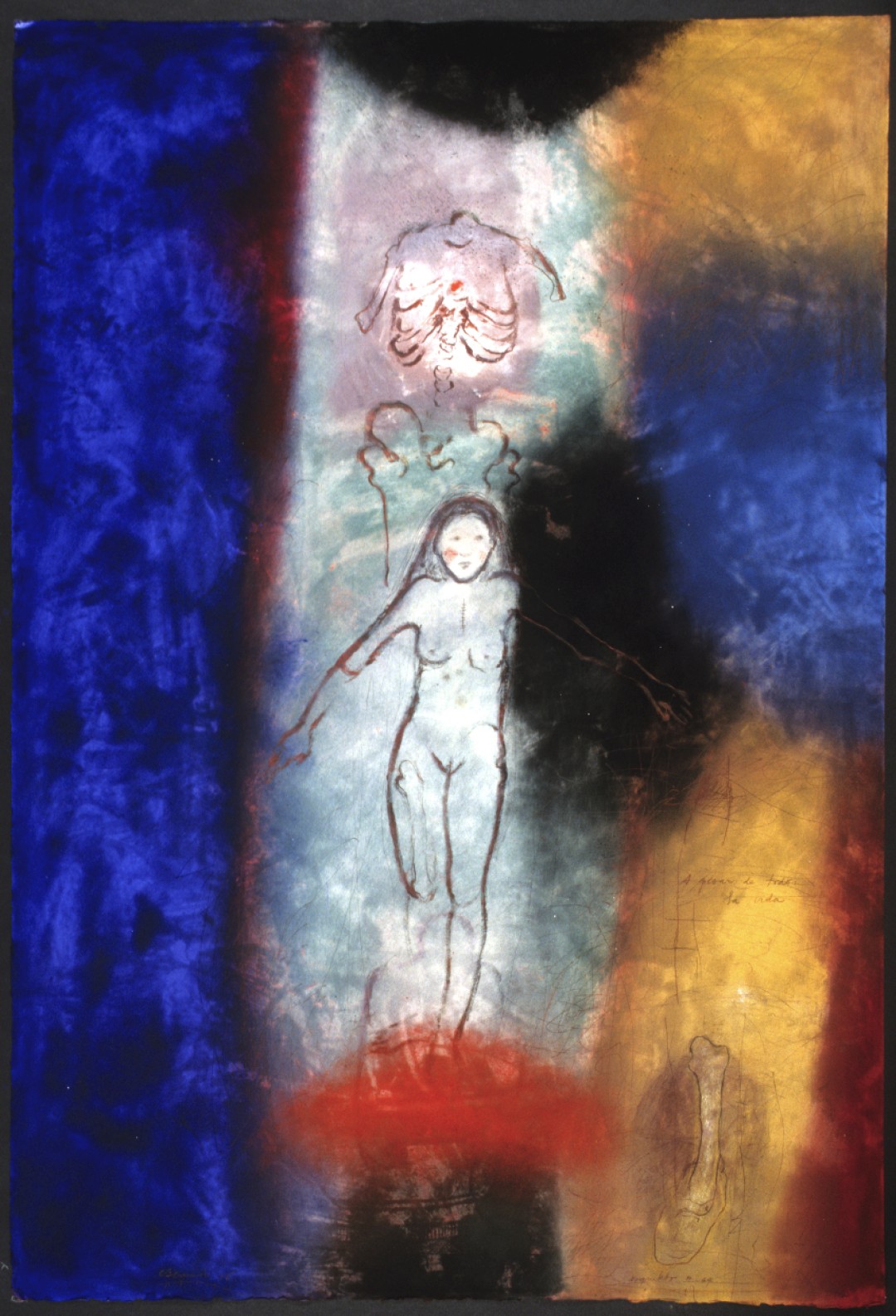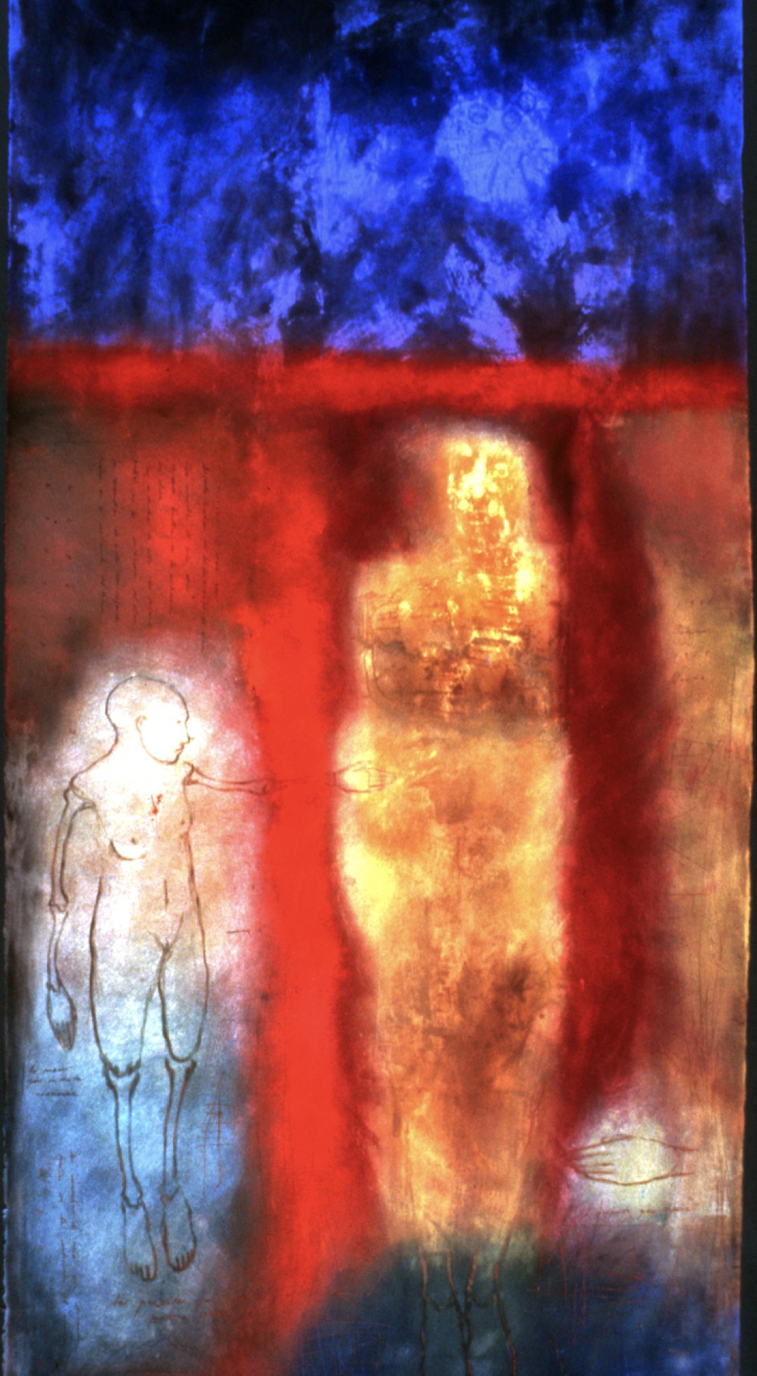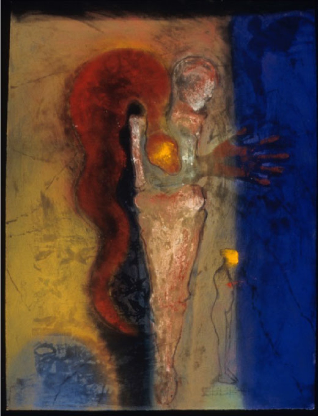 In the fresco on paper technique, pigments are applied directly to the surface. The pigments become the wall. (1995, 30” x 42”)Stains Leave Marks on the Vessel of the Soul