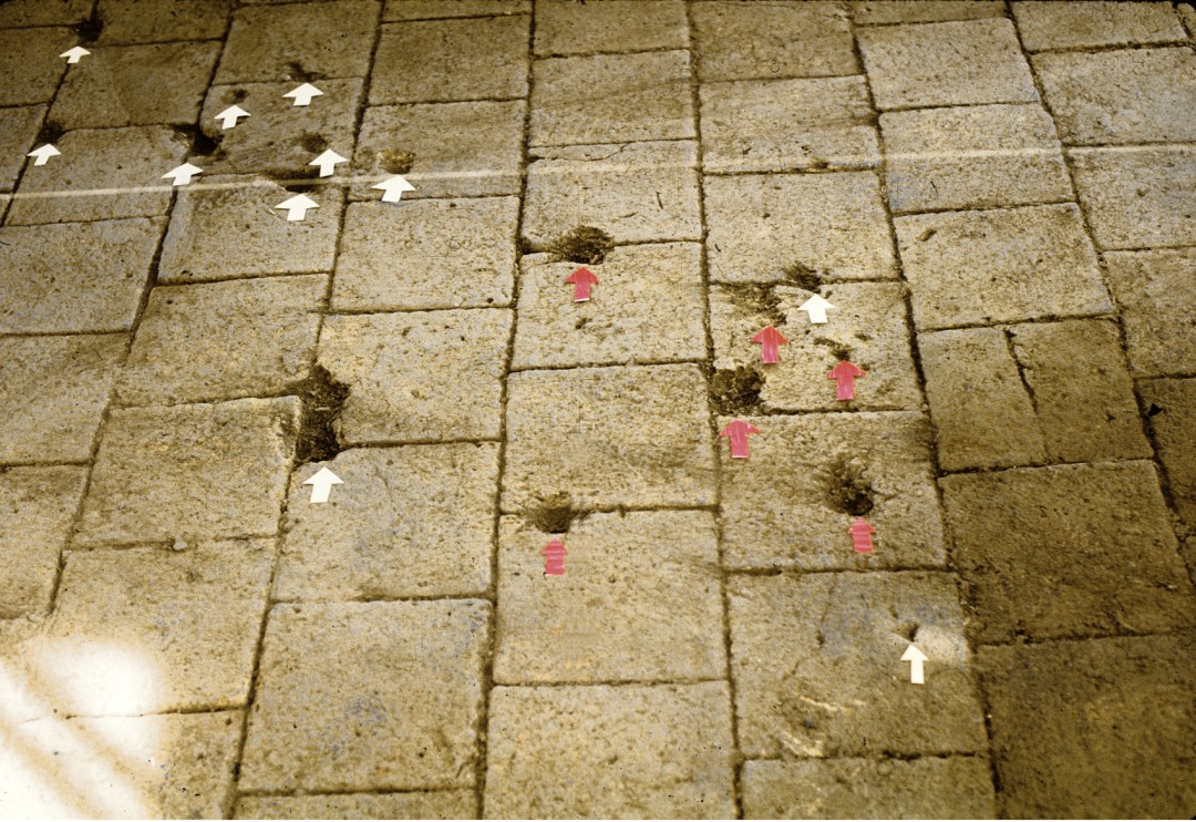 Ground plan of Site #1, dubbed “the Convent,” where the exhumation took place in 1992. The archaeological design was a system of grids and quadrants traced on paper in order to be able to locate all of the findings three dimensionally later on. Graphic by Claudia Bernardi.Site #1, 1992